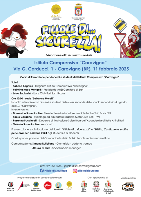 “Pillole di… Sicurezza! Educazione alla sicurezza stradale" l’11 Febbraio appuntamento presso l’I.C. “Carovigno” di Carovigno (BR)Settimo appuntamento di Pillole di…Sicurezza! Educazione alla sicurezza stradale” per l’edizione dell’a.s. 2024-2025, progetto dell’ANSI Comitato di Bari - Associazione Nazionale Scuola Italiana, d’intesa con il Consiglio Regionale - Sezione Biblioteca e Comunicazione Istituzionale.