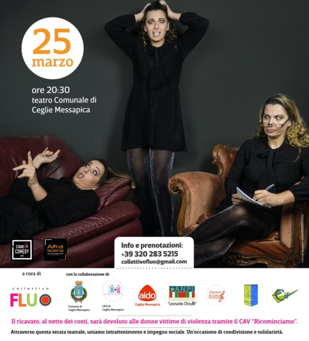 Lo spettacolo teatrale è promosso dal Collettivo Fluo, insieme alle associazioni Aido, Anpi L. Chirulli, CIF, Portatori di Gioia APS, Rotary Club Ceglie M. Terra dei Messapi, e con il Patrocinio del Comune di Ceglie Messapica e il supporto della Commissione Pari Opportunità, in occasione della Giornata internazionale dei diritti della donna.