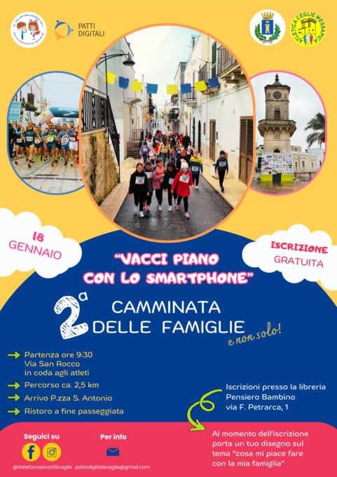 Il Patto digitale "Il telefono senza fili", in occasione della 11a edizione della gara podistica "Corri a Ceglie", organizzata dall'Associazione Atletica Ceglie Messapica con il Patrocinio del Comune di Ceglie Messapica, organizza la 2a Camminata delle famiglie "Vacci piano con lo smartphone" con l'intento di sensibilizzare tutte e tutti a un utilizzo consapevole e informato dei dispositivi digitali come singole persone e in famiglia, soprattutto da parte dei bambini e dei preadolescenti.L'iscrizione alla Camminata delle famiglie è gratuita e può essere effettuata presso la libreria Pensiero Bambino in via Petrarca, 1 a Ceglie M.