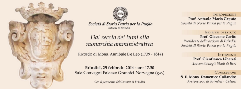 Come la storia di Brindisi, scritta dal Moricino e pubblicata dal Della Monaca, adombra il nesso inestricabile di mito e lavoro razionale, cosí l'opera di Annibale De Leo, nel suo complesso, testimonia della dialettica dell'illuminismo. La storiografia predeleana, specie nel suo strato piú arcaico, appare legata al mito: i racconti derivano ben spesso dalla tradizione popolare. Ma lo spirito di ricerca, che si impadronisce dei miti e li “organizza”, entra in contraddizione con essi. I due concetti infine si separano, per segnare due fasi di un processo storico ancora riconoscibile nelle “cuciture” della stessa redazione di Moricino/Della Monaca; nella loro storia si dissolve l'ordine gerarchico della società con la forma essoterica della rappresentazione anche e proprio quando lo esalta; cantare ire e furori costituisce già una stilizzazione nostalgica di ciò che non si può piú cantare, e il soggetto delle avventure si rivela il prototipo dello stesso individuo borghese il cui concetto ha origine in quella compatta affermazione di sé che troverà in Annibale de Leo (San Vito dei Normanni, 16 giugno 1739 – Brindisi, 13 febbraio 1814), arcivescovo di Brindisi dal 29 gennaio 1798, piena esplicazione.Questi sin da giovane fu avviato agli studi di filosofia e teologia presso le Scuole Pie e il Seminario brindisino. Continuò i suoi studi di diritto ecclesiastico dapprima a Napoli e quindi a Roma. Ritornato a Brindisi, scrisse la sua prima dissertazione su Marco Pacuvio (1763). Di lui resta perenne monumento il fondamentale Codice diplomatico brindisinodi cui la Società di Storia Patria per la Puglia ha curato l'edizione in un arco temporale che va dal 1940 al 2006.