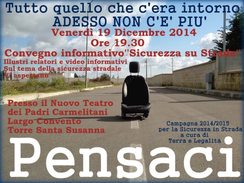 Non volendoci fermare alla sola diffusione online del messaggio '' Pensaci, tutto quello che c'era intorno adesso non c'è più'', abbiamo organizzato un convegno informativo per VENERDI' 19 DICEMBRE 2014 ALLE ORE 19.30 PRESSO IL NUOVO TEATRO DEI PADRI CARMELITANI IN LARGO CONVENTO A TORRE SANTA SUSANNA,