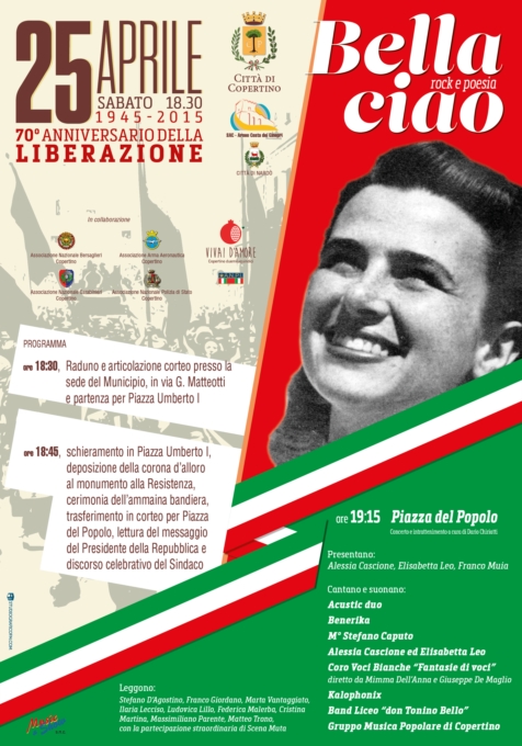 Alle ore 18,30 inizieranno le solenni celebrazioni con il raduno e il corteo che giungerà a Piazza Umberto I per la deposizione della corona d’alloro al Monumento della Resistenza, con l’accompagnamento della Banda Città di Copertino, a cui segue in Piazza del Popolo la lettura del messaggio del Presidente della Repubblica con il discorso celebrativo del Sindaco.