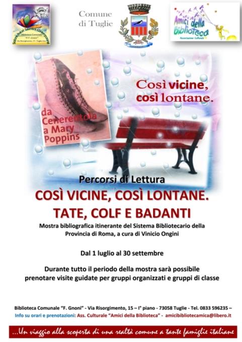 L'Associazione Culturale "Amici della Biblioteca" di Tuglie - con il patrocinio del Comune - ospita fino al 30 settembre nelle sale al I°piano della Biblioteca Comunale "F.Gnoni" la Mostra bibliografica itinerante "Cosi vicine, cosi lontane. Tate, colf e badanti - Percorsi di lettura" a cura di Vinicio Ongini e del dal Sistema Bibliotecario della Provincia di Roma. Si tratta di una mostra fatta principalmente di libri, immagini e parole: circa 150 documenti tra romanzi, diari, atlanti, biografie, manuali, riviste, film, inchieste e reportage che raccontano affetti e sentimenti, separazioni, grandi viaggi, distanze, ricordi: tracce significative di una lotta coraggiosa, avvincente, ostinata, intrapresa - nel corso dei decenni - contro destini di povertà, ignoranza, subalternità.