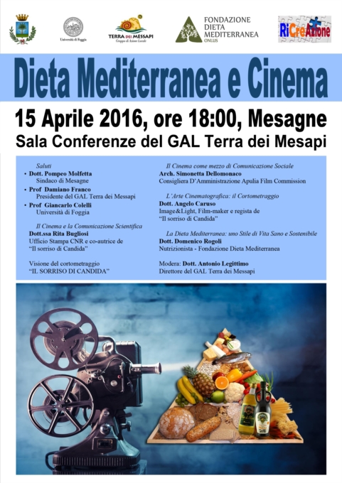 col patrocinio del Comune di Mesagne, GAL, Università di Foggia, Fondazione Dieta Mediterranea, CNR, Associazione Culturale “RiCreAzione”si terrà una tavola rotonda “Dieta Mediterranea e Cinema”. Diversi esponenti del mondo del Cinema, della Nutrizione Umana, della Ricerca Scientifica e dello Sviluppo Rurale dei territori si confrontano. L’obiettivo è di considerare il Cinema come strategia di comunicazione efficace per la diffusione di temi di rilevanza sociale, quali l’adozione di stili di vita sani e sostenibili rappresentati nel modello Dieta Mediterranea.