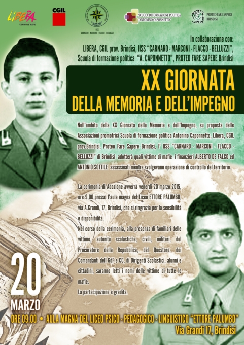 La scuola di Formazione Politica “Antonino Caponnetto” organizza per domani venerdì 20 marzo 2015, la XX Giornata della Memoria e dell’Impegno in ricordo delle vittime di mafie. In tale occasione l’IISS “Carnaro Marconi Flacco Belluzzi” adotterà, quali vittime di mafia, i finanzieri