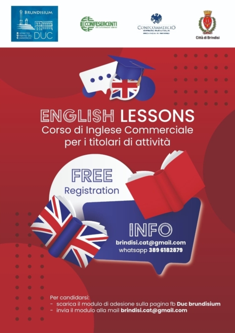 Corso di inglese GRATUITO per titolari di attività commerciali.Il Distretto Urbano del Commercio di Brindisi, con il sostegno di Confesercenti, Confcommercio e Comune di Brindisi, ha organizzato, presso la sede di Confesercenti, un corso di inglese commerciale, completamente gratuito, riservato agli operatori commerciali o loro collaboratori della città di Brindisi. Il corso è iniziato già il 14 ottobre scorso, ma si accettano ancora le iscrizioni.