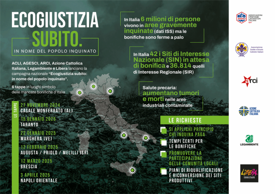 Per riaccendere i riflettori su questi temi ACLI, AGESCI, ARCI, Azione Cattolica Italiana, Legambiente e Libera, fanno squadra e lanciano insieme la campagna nazionale itinerante “Ecogiustizia subito: in nome del popolo inquinato” che le vedrà in azione dal 27 novembre 2024 al 3 aprile 2025 dal nord al sud della Penisola, per le prime sei tappe, che toccheranno alcuni luoghi simbolo dell'ingiustizia ambientale e sociale: dal Piemonte, il 27 novembre, a Casale Monferrato, una delle aree in cui insistevano gli stabilimenti ex Eternit dove ancora oggi l’amianto continua a fare vittime, al SIN di Taranto (15 gennaio); dal SIN di Porto Marghera (VE), la più importante area petrolchimica d’Italia (22 gennaio) a quello di Priolo, Augusta, Melilli e Siracusa (12 febbraio); dal sito ex Caffaro di Brescia (12 marzo), dove è stata riscontrata una contaminazione diffusa da metalli pesanti e policlorobifenili (PCB), al SIN Napoli Orientale (3 aprile).
