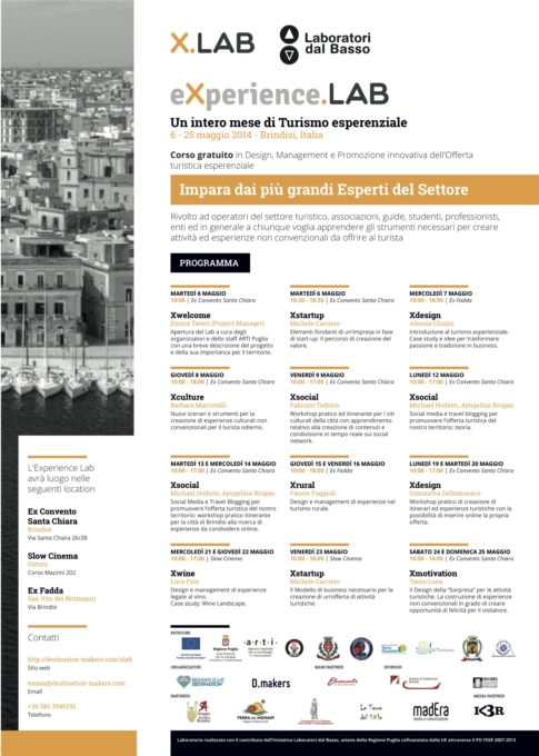 Sono aperte le adesioni al Laboratorio dal Basso eXperience.LAB, il corso gratuito in design, management e promozione innovativa dell'offerta turistica esperienziale in programma a Brindisi e provincia dal 6 al 25 maggio. Il laboratorio prende il via martedì 6 maggio alle ore 10, nell'Ex Convento Santa Chiara, con Xwelcome, un incontro di presentazione e breve descrizione del progetto e della sua importanza per il territorio, aperto a tutti. L'incontro è a cura di Emma Taveri (project manager del Laboratorio dal Basso, fondatrice del brand territoriale Brindisi is my Destination) e Paolo d'Addabbo (staff Arti Puglia). Subito dopo la presentazione, si entra nel merito del programma con Xstartup, il primo incontro dell'eXperience.Lab, con il docente Michele Carriero (motivatore, startupper e facilitatore alla creazione d' impresa per lo sviluppo dei territori) che espone gli elementi fondanti di un’impresa in fase di start-up al fine di realizzare un percorso di “creazione del valore”.Per conoscere il programma completo e iscriversi gratuitamente a uno o più moduli del laboratorio è possibile consultare il sito http://destination-makers.com/xlab, compilare il modulo di iscrizione on line su http://www.eventbrite.it/o/xlab-by-dmakers-6445457571 o chiamare il numero della segreteria organizzativa 340.3946291.