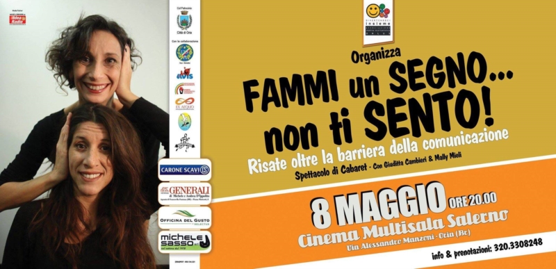 L'Associazione Divertendoci Insieme, con il patrocinio del Comune di Oria, e in collaborazione con l’Ente Nazionale Sordi Sezione di Brindisi, l’Avis di Oria, l’associazione Ex Aequo, l’Associazione Bambini Cardiopatici Congeniti e la Prociv-Arci di Oria presenta giovedì 8 maggio alle ore 20,00 presso il Cine Teatro Gassman di Oria : "FAMMI UN SEGNO....NON TI SENTO " con Giuditta Cambièri e Mally Mieli. La manifestazione, nata da un’idea di Tiziana di Levrano, ha l’obbiettivo di mettere sotto i riflettori un mondo nuovo fatto di mani che si muovono in armonia con il solo scopo di comunicare e creare un ponte tra sordo e udente in una società dove spesso diamo troppo peso alle apparenze.