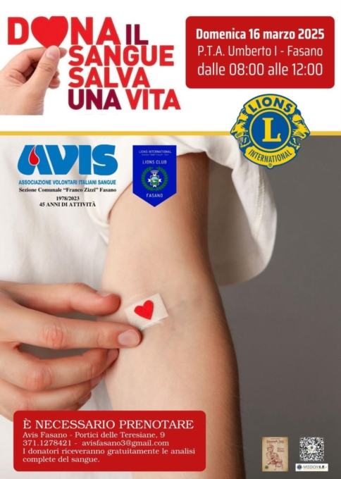 Domenica 16 marzo 2025, dalle 8 alle 12, presso il primo piano del P.T.A. “Umberto I” di Fasano, il Lions Club Fasano, presieduto da Felice Lanzisera, e l’AVIS, sezione comunale “Franco Zizzi” di Fasano presieduta da Pasquale Moretti, promuovono una giornata dedicata alla donazione del sangue. I cittadini interessati alla donazione dovranno anticipatamente prenotarsi recandosi presso la sede dell’AVIS di Fasano (Portici delle Teresiane n. 9), o chiamando il n. 371 1278421 oppure inviando una mail all’indirizzo: avisfasano3@gmail.com. I donatori riceveranno gratuitamente le analisi complete del sangue.