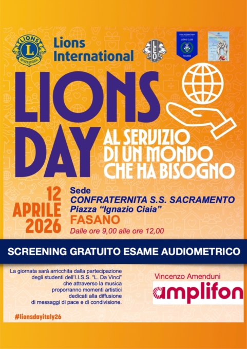 Il Lions Club Fasano ed il Leo Club Fasano domenica 12 aprile 2026, dalle ore 9:00 alle ore 12:00, saranno impegnati in Piazza Ciaia per il “Lions Day”, iniziativa tesa a far conoscere le tante attività svolte dal Lions International, la più grande organizzazione mondiale di servizio umanitario fondata da Melvin Jones nel 1917. Nella mattinata i soci fasanesi presenteranno ai cittadini le iniziative già concretamente realizzate e illustreranno gli ambiziosi progetti ancora da realizzare.