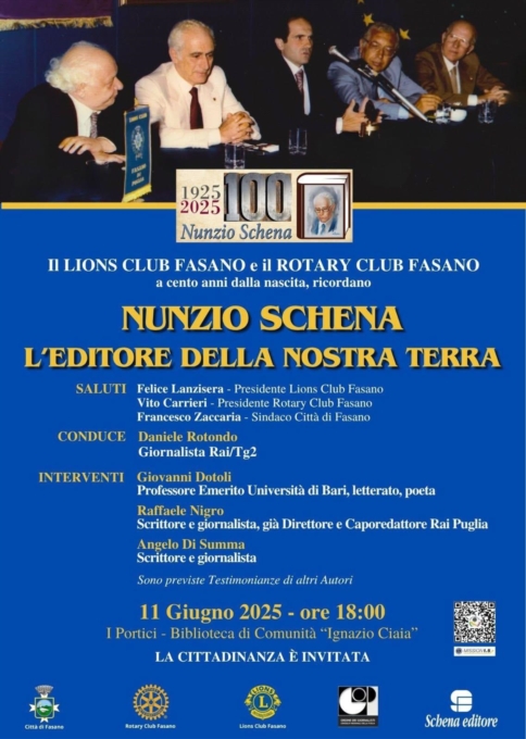 Il Lions Club Fasano e il Rotary Club Fasano oggi, mercoledì 11 giugno, alle ore 18, presso “I Portici Biblioteca di Comunità - Ignazio Ciaia” di Fasano promuovono un incontro per ricordare: “Nunzio Schena, l’editore della nostra terra”.L’appuntamento si inserisce nel ricco calendario di eventi speciali patrocinati dal Comune di Fasano per celebrare il centenario della nascita di Nunzio Schena, figura di spicco della cultura locale e fondatore della casa editrice Schena Editore. Nato nel 1925, Nunzio Schena ha dedicato la sua vita alla promozione della cultura e della storia di Fasano, lasciando un’eredità indelebile nella comunità.