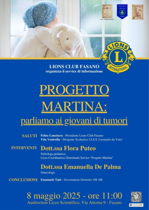 Il Lions Club Fasano giovedì 8 maggio, avvalendosi del contributo di medici specialisti, presenterà agli studenti dell’I.I.S.S. “L. Da Vinci” di Fasano un interessante momento di formazione per la prevenzione dei tumori dal titolo: “Progetto Martina: parliamo ai giovani di tumori”.L’iniziativa, che si svolgerà in mattinata presso l’auditorium dello stesso istituto, si aprirà con i saluti di Felice Lanzisera, presidente del Lions Club Fasano, e di Vita Ventrella, dirigente scolastico dell’I.I.S.S. “L. Da Vinci” di Fasano.