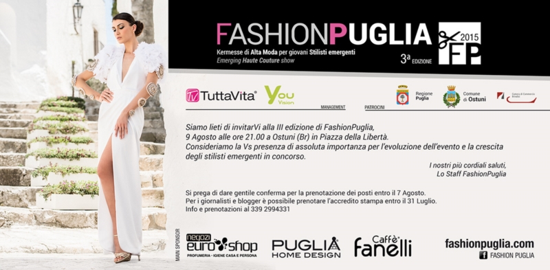 La kermesse d’alta moda emergente Fashion Puglia dà il via alla 3° edizione, che si terrà il 9 agosto in piazza a OSTUNI. Organizzato dal social del divertimento TuttaVita, in collaborazione con l’agenzia di marketing e comunicazione YouVision, l’evento è patrocinato dal Comune di Ostuni. Per omaggiare la città ospitante, l’organizzazione di Fashion Puglia ha commissionato alla giovane stilista vincitrice della passata edizione, Rossana Giovinazzi, una creazione inedita d’alta moda sulla Città Bianca. L’abito, ritratto nell’incantevole cornice del borgo antico di Ostuni, è il simbolo della kermesse 2015.