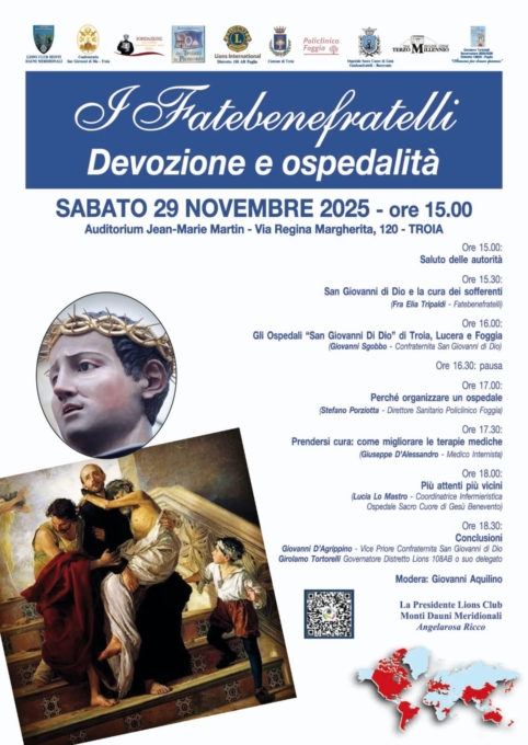 Dopo i Saluti delle Autorità, il programma prevede l'intervento introduttivo di Fra Elia Tripaldi - Fatebenefratelli su "San giovanni di Dio e la cura dei sofferenti", a cui seguirà quello di Giovanni Sgobbo - Confraternita SGD "Gli Ospedali 'San Giovanni di Dio' di Troia, Lucera e Foggia", quindi le relazioni di Stefano Porziotta - DS Policlinico Foggia "Perché organizzare un ospedale", Giuseppe D'Alessandro - Medico Internista "Prendersi cura: come migliorare le terapie mediche" e Lucia Lo Mastro - Coordinatrice Infermieristica Ospedale Sacro Cuore di Gesù Benevemto "Più attenti più vicini". Conclusioni affidate a Giovanni D'Agrippino - Vice Priore Confraternita SGD e Girolamo Tortorelli Governatore Distretto Lions 108AB. Modera: Giovanni Aquilino.