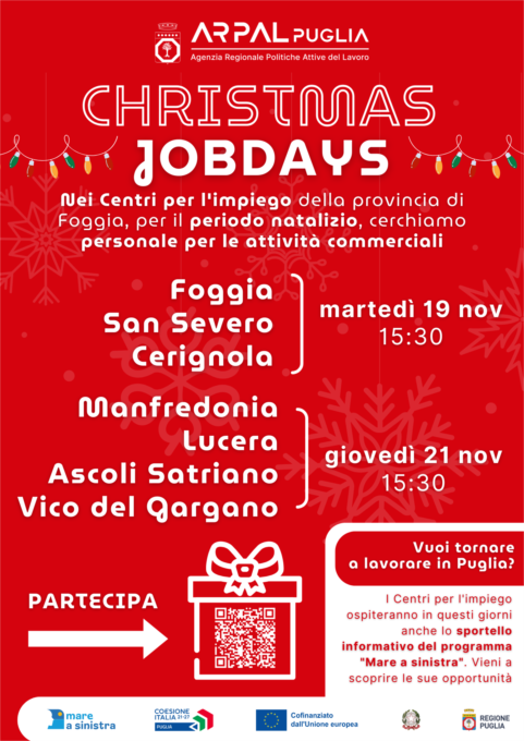 I Christmas JobDAYS si terranno nei 7 CPI della provincia di Foggia, per permettere la partecipazione al maggior numero di persone possibile: