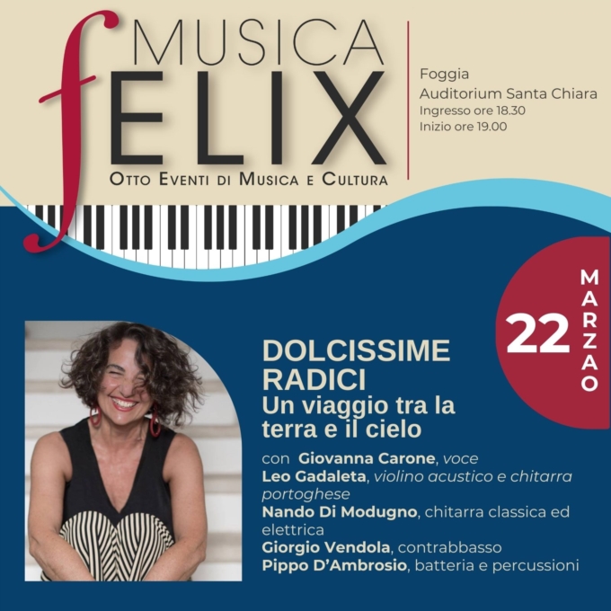 Prossimo evento sabato 22 marzo, alle 19, sempre all’Auditorium Santa Chiara di Foggia, il complesso monumentale recentemente restaurato e portato agli antichi splendori dalla Fondazione che lo gestisce. Per il sesto spettacolo in programma, assisteremo a “Dolcissime radici. Un viaggio tra la terra e il cielo” con la cantante Giovanna Carone e i musicisti Leo Gadaleta, Nando Di Modugno, Giorgio Vendola e Pippo D’ambrosio. Un viaggio musicale che raccoglie brani di sette secoli di storia della musica, dal Trecento alla musica barocca per toccare la moderna canzone d’autore. Filo conduttore del progetto è il personale percorso di ricerca dell’artista pugliese Giovanna Carone intorno alla lingua italiana e alla sua evoluzione in relazione alla musica e alla poesia. La radice comune è la nostra lingua meravigliosa, il sapore della parola ricercata, i bassi ostinati, la morbidezza della melodia italiana, i versi. Senza tempo, nel tempo.