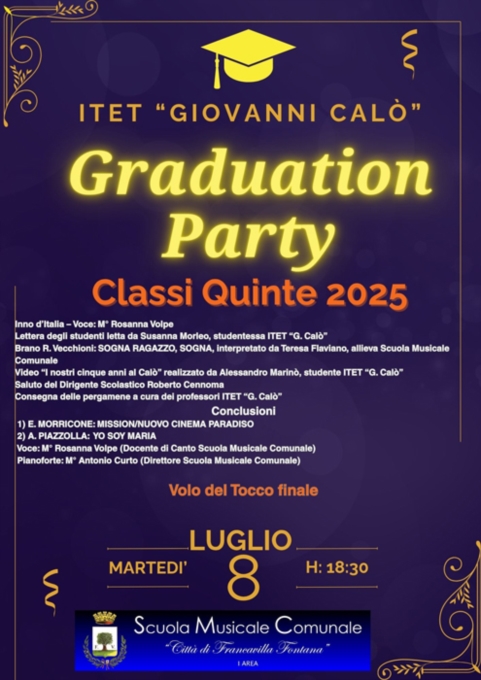 OGGI, Martedì 8 luglio alle ore 18:30 la prima cerimonia di consegna dei diplomi agli studenti maturandi dell'ITET "G. Calò" di Francavilla Fontana.Per la prima volta nella sua storia, l'ITET "G. Calò" di Francavilla Fontana organizza una cerimonia ufficiale di consegna dei diplomi per gli studenti che hanno appena conseguito la maturità.