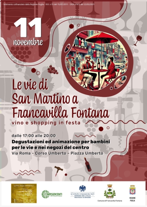 “Le vie di San Martino a Francavilla Fontana”, manifestazione promossa dal DUC Città degli Imperiali.In continuità con quanto proposto negli anni precedenti, prosegue anche quest’anno l’appuntamento con “Le Vie di San Martino a Francavilla Fontana”. La Manifestazione, a cura del DUC Città degli Imperiali, è organizzata in stretta collaborazione con il Comune di Francavilla Fontana e con il sostegno delle associazioni di categoria Confesercenti e Confcommercio, tutti soggetti promotori del Distretto Urbano del Commercio.