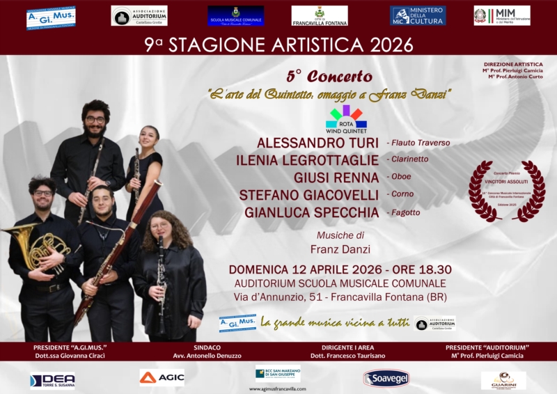 Il "Rota Wind Quintet", composto dai talentuosissimi Alessandro TURI (Flauto Traverso), Giusi Renna (Oboe), Ilenia LEGROTTAGLIE (Clarinetto), Stefano GIACOVELLI (Corno) e Gianluca SPECCHIA (Fagotto), si esibirà in occasione del 5° appuntamento concertistico della nona Stagione Artistica 2026 organizzata dall'Associazione A.Gi.Mus. di Francavilla Fontana e dall'Associazione Auditorium di Castellana Grotte, sotto la direzione artistica dei maestri Pierluigi Camicia e Antonio Curto, e dal Comune di Francavilla Fontana, con il Patrocinio del MIC, del MIM e della Scuola Musicale Comunale "Città di Francavilla Fontana".L'appuntamento, previsto per domenica 12 aprile 2026, alle ore 18.30, presso l'Auditorium della Scuola Musicale Comunale di Francavilla Fontana, si intitola ""L'Arte del Quintetto: Omaggi a Franz Danzi" e saranno eseguite musiche di Franz Danzi.