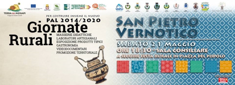 Oggi ultimo evento con il ciclo delle Giornate RuraliOggi, dalle ore 18.30, ultimo appuntamento delle GIORNATE RURALI indette dal GAL TERRA DEI MESSAPI, presso l'aula consiliare del Comune di San Pietro Vernotico per l’incontro/dibattito “Il Territorio che Vogliamo” con i protagonisti della nostra rete.