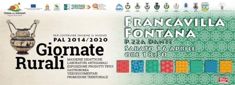 Sabato 16 aprile a Francavilla Fontana ci sarà la seconda giornata rurale!L'appuntamento è per sabato 16 aprila a partire dalle ore 18.00 presso la Sala Grande del Castello Imperiali. Dopo una breve presentazione degli obiettivi raggiunti durante la passata programmazione, sarà prioettato il video-documentario di Simone Salvemini sulle bellezze e le peculiarità della città di Francavilla Fontana; seguirà un momento di festa, musica e degustazioni in Piazza Dante.