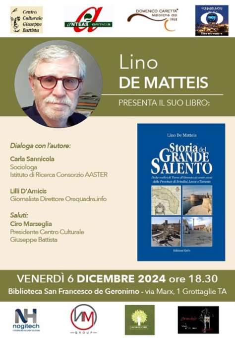 Presso la Biblioteca San Francesco de Geronimo di Grottaglie, il Centro Culturale “G. Battista” con l’Anteas Grottaglie, la testata giornalistica oraquadra.info e le Maioliche Caretta, presentano venerdì 6 dicembre, alle 18:30, Storia del Grande Salento (Edizioni Grifo) di Lino De Matteis, l’autore dialogherà con Carla Sannicola, sociologa e la giornalista Lilli D’Amicis, coordina Ciro Marseglia, presidente del Circolo “G. Battista”. Il nuovo incontro letterario avviene grazie all’ospitalità del presidente di "Anteas Grottaglie" Cosimo Luccarelli e di tutto il direttivo del Centro Culturale “G. Battista” con i numerosi soci che non mancano di partecipare a questi eventi culturali. Nel cuore pulsante della storia e della cultura salentina, emerge la “Storia del Grande Salento”, un’opera che esplora con meticolosa attenzione le radici e l’identità di questa terra affascinante. De Matteis, giornalista e scrittore di lungo corso, ci guida attraverso un viaggio nel tempo, dalle radici dell’antica Terra d’Otranto ai cento anni delle province di Brindisi, Lecce e Taranto. «Un libro in controtendenza – spiega Lino De Matteis – per mettere in luce elementi unitari che possono tenere insieme il territorio e trasformarlo in laboratorio di aggregazione, in un mondo sempre più preda di sovranismi e risorgenti nazionalismi. Per ritrovare lo spirito unitario bisogna ripartire dai territori, conoscendo la loro storia per capire il presente e guardare insieme ad un futuro di crescita comune». Un libro di grande attualità, perché dalla storia di questa terra emerge anche l’indicazione della sua possibile proiezione futura nello spirito confederativo che, pur se con alterne vicende, ha costantemente caratterizzato le tre province di Brindisi, Lecce e Taranto dalla tripartizione fascista della penisola salentina ad oggi. Ricerca