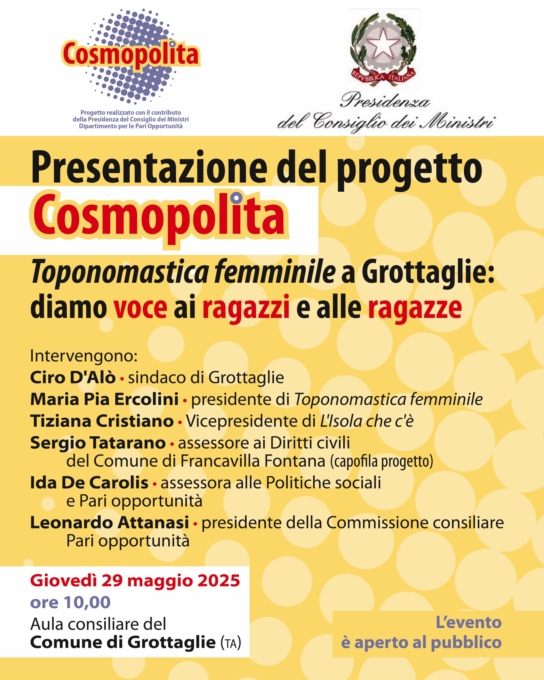 Giovedì 29 maggio alle ore 10:00, presso l'Aula Consiliare del Comune di Grottaglie, sarà presentato il progetto di rete "Cosmopolita", finanziato con 200.000 euro dal Dipartimento per le Pari Opportunità della Presidenza del Consiglio dei Ministri nell'ambito del bando nazionale per la prevenzione della violenza di genere.Il progetto, che ha ottenuto il secondo posto nella graduatoria nazionale tra oltre 500 candidature, è frutto di un ampio lavoro di rete che vede come enti capofila il Comune di Francavilla Fontana e l'Associazione Toponomastica Femminile, insieme ai Comuni di Bari, Lecce, Brindisi, Grottaglie, Bisceglie, Candela, all'Associazione L'Isola che c'è onlus, alla Regione Puglia, all'Università degli Studi di Bari, all'Università del Salento e a più di 60 realtà tra istituzioni e associazioni impegnate sul tema delle pari opportunità.