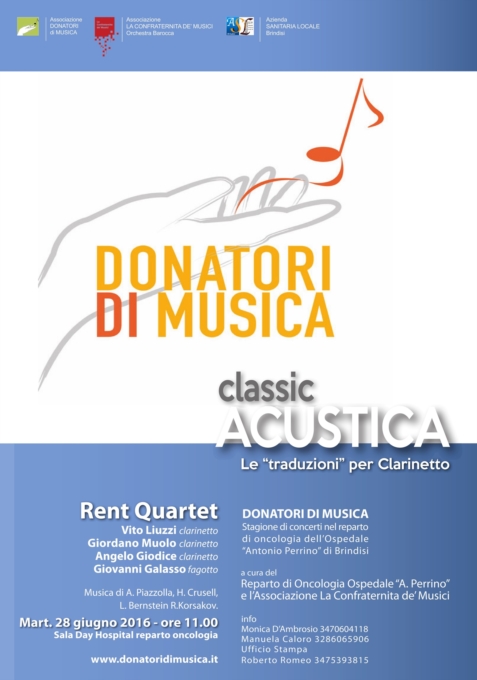 Martedì 28 giugno (ore 11) il secondo concerto nel reparto oncologico dell’ospedale «Perrino» di Brindisi. L’iniziativa fa parte di «Donatori di Musica», una rete di musicisti, medici, infermieri, volontari che organizza stagioni di concerti negli ospedali italiani, principalmente in reparti oncologici. Si chiamano «Donatori di Musica» e sono una rete di volontari - medici, infermieri e oltre trecento musicisti - che dal 2009 organizza stagioni di concerti gratuite nelle strutture oncologiche di alcuni ospedali italiani. Tra queste, dallo scorso maggio, c’è anche l’Unità operativa di Oncologia dell’ospedale «Perrino» di Brindisi, diretta dal prof. Saverio Cinieri. Obiettivo: una nuova cultura della cura che avvicini medico e paziente e umanizzi la terapia attraverso la bellezza e le emozioni della musica. L’iniziativa, intercettata e proposta dall’orchestra barocca «La Confraternita de’ Musici» e dal suo direttore artistico, M.O Cosimo Prontera, torna martedì prossimo, 28 giugno alle ore 11, nella sala day hospital dell’Oncologico di Brindisi, questa volta con il concerto «Classic Acustica» del «Rent Quartet Ensemble» (Vito Liuzzi, Angelo Giodice e Giordano Muolo al clarinetto, Giovanni Galasso al fagotto), quartetto che nasce dall’interesse comune verso la musica cameristica e dalla volontà di ogni singolo componente di esprimere la propria esperienza, sia in qualità di professore d’orchestra sia in veste solistica.