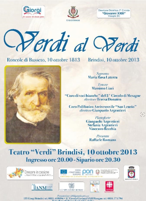 L’Itis “G.Giorgi” di Brindisi rende omaggio a Giuseppe Verdi nel bicentenario della sua nascita (1813-2013) con un evento musicale senza precedenti e ad ingresso gratuito. Allo scoccare del 200entesimo compleanno, il 10 ottobre prossimo alle 20.30, al Nuovo Teatro Verdi andrà in scena una serata interamente dedicata al compositore italiano con le arie delle sue maggiori opere. Il concerto “Verdi al Verdi”, è la prima tappa di un percorso culturale che vede coinvolti anche la scuola primaria “Giovanni XXIII” di Mesagne, il liceo “Marzolla” di Brindisi e l’istituto comprensivo “Casale”. Un progetto in rete per contrastare la dispersione scolastica voluto dal Ministero per la Coesione Territoriale e il Miur. Protagonisti della serata: Maria Rosa LATERZA (soprano), Massimo LIACI (tenore), il Coro polifonico arcivescovile “San Leucio”, diretto dal maestro Gianpaolo ARGENTIERI e il coro di voci bianche del 2°circolo di Mesagne diretto da Teresa DONATEO. “Il concerto “Verdi al Verdi” – afferma Maria Luisa Sardelli, dirigente scolastico dell’itis “Giorgi” – rappresenta un esempio di relazione con il territorio che può avvicinare il mondo della scuola a quello della vita. Lo staff organizzativo del nostro istituto ha seguito ogni fase del progetto interfacciandosi e confrontandosi con gli esperti consulenti, appositamente nominati dal Gruppo di Direzione e Coordinamento del progetto F3 tra cui Carmelo Grassi, consulente organizzativo, il maestro Gianpaolo Argentieri, consulente artistico e il soprano Maria Rosa Laterza, consulente musicale”. Sono 995 le poltrone a disposizione degli spettatori, 658 in platea e 337 in galleria.