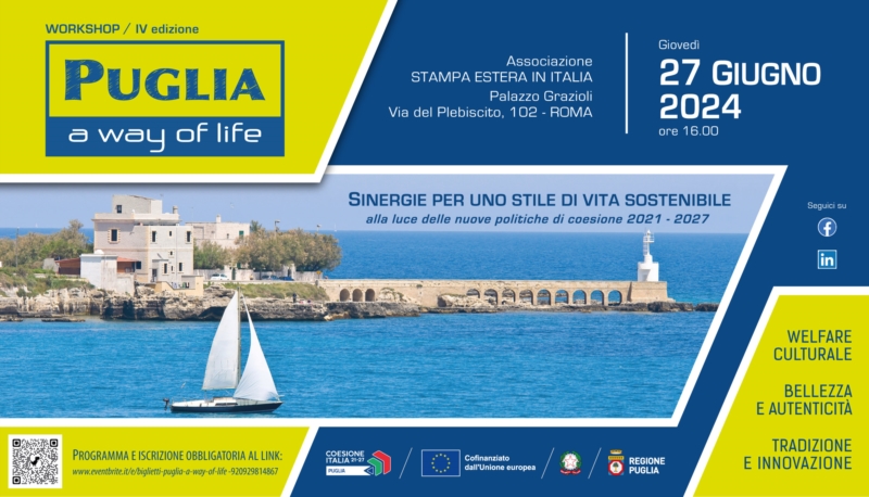 Questo modello di successo è al centro della quarta edizione del workshop “Puglia, a way of life” che si terrà giovedì 27 giugno alle 16,00, nella sala conferenze della Stampa Estera, a Palazzo Grazioli (via del Plebiscito, 102) a Roma. Un focus su uno stile di vita, appunto il “way of life”, che si indirizza verso il benessere inteso in senso ampio, favorendo uno stretto legame con il territorio. L’utilizzo strategico delle risorse comunitarie, la valorizzazione della cultura, il posizionamento alto delle attività produttive, una comunicazione efficace sono i punti principali di un’attrattività che coinvolge residenti e turisti.
