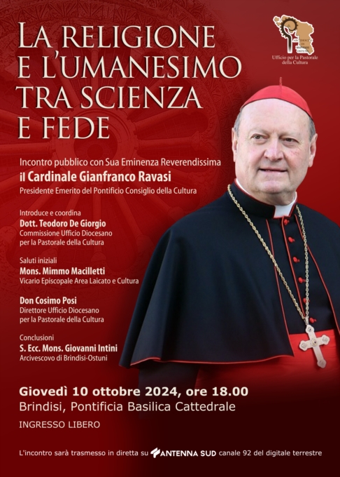 OGGI, Giovedì 10 ottobre, alle ore 18.00, presso la Pontificia Basilica Cattedrale di Brindisi il Cardinale Gianfranco Ravasi, tra le intelligenze più aperte e vivaci del panorama culturale internazionale, terrà una conferenza pubblica dal titolo La religione e l'umanesimo tra scienza e fede. L'evento, promosso e organizzato dall'Ufficio per la Pastorale della Cultura dell'Arcidiocesi di Brindisi-Ostuni e volto a favorire il dialogo tra credenti e non credenti, si preannuncia come un momento di riflessione profonda su temi che da sempre affascinano l'umanità. Il Cardinale Ravasi, Presidente emerito del Pontificio Consiglio della Cultura e noto per la sua capacità di coniugare profondità teologica e rigore scientifico, guiderà il pubblico in un percorso affascinante alla scoperta dei punti di contatto e tensione tra fede, ragione e scienza.La conferenza, introdotta e coordinata dal dottor Teodoro De Giorgio, storico dell'arte dell'Ufficio diocesano per la Pastorale della Cultura, sarà aperta a tutti e fruibile in diretta anche su Antenna Sud Extra (canale 92 del digitale terrestre). Tra gli interventi previsti ci saranno in apertura quelli di Monsignor Mimmo Macilletti, Vicario episcopale per l'area laicato e cultura, di don Cosimo Posi, direttore dell'Ufficio diocesano per la Pastorale della Cultura, e in chiusura di Sua Eccellenza Monsignor Giovanni Intini, Arcivescovo di Brindisi-Ostuni. Due brevi momenti musicali per violino e arpa, a cura di Gilda e Annalisa Ciaccia, precederanno e chiuderanno la conferenza del Cardinale Ravasi.