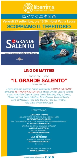 "Il Grande Salento", la nuova edizione della guida di turismo e cultura del territorio dalla Glocal Editrice, sarà presentata a Lecce, venerdì 23 settembre 2016, alle ore 18,30, presso l'Hotel Patria Palace, in piazzetta Riccardi. All'iniziativa "Scopriamo il territorio", promossa dalla libreria Liberrima di Lecce, oltre al direttore della guida, Lino De Matteis, parteciperanno l'assessore regionale alla Cultura e Turismo Loredana Capone, l'assessore comunale di Lecce e coordinatore del progetto "Salento Patrimonio Unesco" Alessandro Delli Noci, il direttore del "Nuovo Quotidiano di Puglia" Claudio Scamardella, il direttore del primo quotidiano on line "Affaritaliani.it" Angelo M. Perrino, il registra Edoardo Winspeare e Maurizio Guagnano della libreria Liberrima. L'incontro sarà presentato e coordinato dal giornalista Marcello Favale. Il volume rappresenta una nuova ed originale proposta di lettura del territorio dell'intera penisola salentina, per la prima volta raccontata unitariamente attraverso 15 itinerari che mettono in risalto l'identità della varie aree che la compongono: oltre alle città di Brindisi, Lecce e Taranto, i comuni del Capo di Leuca, Grecìa Salentina, Magna Grecia, Riviera dei Trulli, Serre Salentine, Terra d'Arneo, Terra d'Otranto, Terra dei Messapi, Terra delle Gravine, Terre del Primitivo, Valle d'Itria e Valle della Cupa.