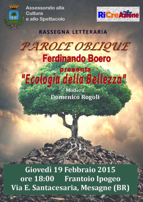 L'incontro ruoterà attorno al saggio di divulgazione scientifica 'Ecologia della Bellezza', e si terrà giovedì 19 gennaio alle ore 18:00, presso il Frantoio Ipogeo in via E. Santacesaria, Mesagne BR. Moderatore della serata sarà Domenico Rogoli, biologo e presidente dell'associazione 'RiCreAzione'.