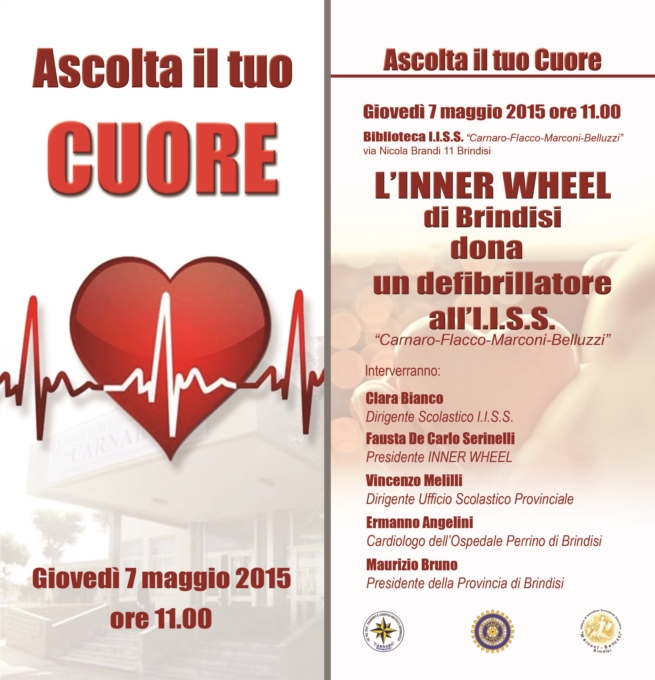Giovedì 7 Maggio 2015 alle ore 11.00, presso la Biblioteca dell’I.I.S.S. “Carnaro-Flacco-Marconi-Belluzzi”, avrà luogo una cerimonia speciale: la Presidente dell’’INNER WHEEL di Brindisi, Dott.ssa Fausta De Carlo Serinelli, donerà a nome del Club Service di Brindisi, un defibrillatore alle scuole ubicate al Casale rappresentate dalla Dirigente Prof.ssa Clara Bianco.L’iniziativa si inserisce nel più ampio progetto dell’Inner Wheel, Associazione di Volontariato mondiale femminile, di essere vicina alla Comunità di cui è parte integrante, di sostenere con una concreta e fattiva vicinanza le situazioni di difficoltà, di emarginazione. I vari interventi nascono, infatti, dalla constatazione che la collaborazione fra pubblico e privato sia indispensabile per risolvere o alleviare almeno in parte problemi e situazioni di bisogno. La solidarietà e la promozione del servizio in favore dei più deboli è alla base della visione dell’Inner Wheel.