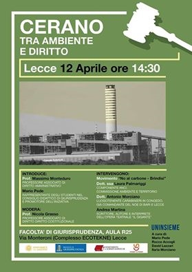 Martedì 12 aprile 2016 alle 14.30 si svolgerà a Lecce il seminario "Cerano: tra ambiente e diritto" organizzato da UNINSIEME presso la Facoltà di Giurisprudenza dell'Università del Salento.Introducono l'incontro Massimo Monteduro - professore di Diritto Amministrativo dell'Università del Salento, Mario Pede - rappresentante degli studenti nel Consiglio Didattico di Giurisprudenza e promotore dell'iniziativa. Intervengono rappresentanti dei No al Carbone, la dott.ssa Laura Palmariggi - componente ANCI Commissione Ambiente e Territorio, il dott. Antonio Morciano - Luogotenente già Comandante del NOE di Bari e Lecce. Modera Nicola Grasso - Professore associato di Diritto Costituzionale. A fine incontro seguirà "Il Gigante", spettacolo teatrale di Andrea Martina. ( INFO SULLO SPETTACOLO )
