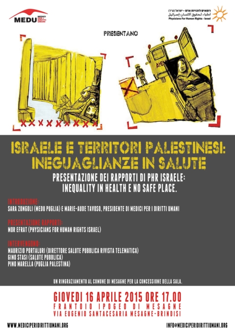 Medici per i Diritti Umani (MEDU) presenta due rapporti indipendenti realizzati da Medici per i Diritti Umani-Israele (Physicians for Human Rights Israele – PHR Israele) sull'accesso alla salute del popolo palestinese. Il rapporto Inequality in Health analizza per la prima volta il divario in termini sanitari tra i cittadini israeliani (compresi i coloni negli insediamenti in Cisgiordania) e i residenti dei Territori palestinesi. Quest'ultimi presentano, rispetto ai primi, una speranza di vita di dieci anni inferiore, una mortalità infantile cinque volte più elevata e una mortalità materna più alta del quadruplo. Il secondo, No Safe Place ("Nessun luogo sicuro"), è il primo rapporto medico indipendente sugli eventi dell'operazione "Protective Edge" ("Margine di protezione") messa in atto dall'esercito israeliano nella Striscia di Gaza tra l'8 luglio e il 26 agosto del 2014.