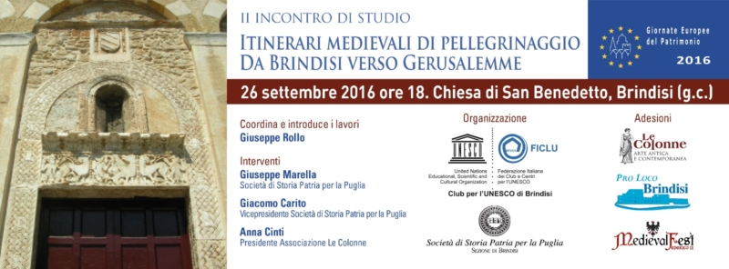 Lunedì 26 settembre 2016, con inizio alle ore 18.00, nella chiesa di San Benedetto in Brindisi (g.c.), si avrà il II Incontro di studio sugli Itinerari medievali di pellegrinaggio con riferimento particolare al tema Da Brindisi a Gerusalemme. Ne discuteranno Giacomo Carito, vicepresidente della Società di Storia Patria per la Puglia, Anna Cinti, Presidente Associazione Le Colonne, e Giuseppe Marella del Viator Studies Center - Research and Development of Vie Francigene and Historical Routes - Università del Salento. I lavori, introdotti e coordinati da Giuseppe Rollo della sezione di Brindisi della Società di Storia Patria per la Puglia, saranno aperti dagli indirizzi di saluto delle autorità e dei responsabili del Club per l'Unesco di Brindisi e della Società di Storia Patria per la Puglia, Sezione di Brindisi, sodalizi promotori e organizzatori. Aderiscono all'iniziativa l'associazione "Le Colonne", la Pro Loco di Brindisi e il Medieval Fest.L'Italia è meta, per essere sede del romano pontefice, di chi fa della fede una ragione di vita e di chi vuole conoscere alle radici un mondo che ha saputo creare arte, architetture e oggetti di inestimabile valore. Le mete più frequentate, già a partire dal IV secolo, sono la Terrasanta, cioè i luoghi della vita e della morte di Gesù Cristo e Roma, sacra per la tomba di san Pietro. Poi, col IX secolo, acquista sempre più importanza il santuario di San Jacopo di Compostela, nella Spagna nord-occidentale, città sorta attorno al sepolcro dell'apostolo Giacomo. In Puglia il cammino della Via Francigena attraversa per intero il territorio regionale, dai Monti Dauni nell'Appennino settentrionale per giungere fino a Brindisi, principale città di imbarco per Gerusalemme, con un itinerario principale che conduce a Monte Sant'Angelo per scendere lungo la costa e una dorsale interna. Con deliberazione della giunta regionale pugliese del I luglio 2013, n. 1174 si è avuta la formale approvazione del tracciato del percorso che la Regione Puglia ha inoltrato all'Istituto Europeo degli Itinerari Culturali per ottenere il riconoscimento dalConsiglio d'Europa.