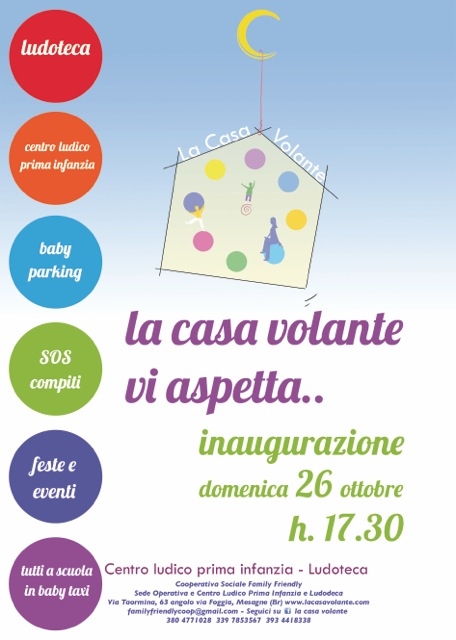 Dopo tanto lavoro e tante attese, finalmente La Casa Volante si farà conoscere al pubblico domenica prossima, 26 ottobre, quando aprirà ufficialmente i propri cancelli. Ludoteca e Centro Ludico Prima Infanzia, La Casa Volante è il primo risultato concreto raggiunto dalla Cooperativa Sociale “Family Friendly”, supportata, nel suo percorso costitutivo, dall’Ente di formazione Terra dei Messapi e beneficiaria dei finanziamenti destinati alle aree rurali dal PSR PUGLIA 2007/2013 diffusi sul territorio dai Gruppi di Azione Locale, nel particolare il GAL Terra Dei Messapi di Mesagne che ha finanziato la Cooperativa con risorse destinate alla Misura 312 per lo sviluppo di nuove micro imprese.La Casa Volante, potrebbe essere definita come una semplice ludoteca, un’altra che apre con i soliti servizi (seppur i soliti servizi ancora non bastano a soddisfare i bisogni di un intera città come quella di Mesagne), invece, è ben altro. Stare con i bambini non significa solo intrattenerli ma soprattutto stimolare la loro fantasia, la loro creatività in maniera produttiva, risalendo dalle radici di una società e di una storia che spesso tendiamo a dimenticare. Le attività ludiche ed educative insegneranno ai bambini il significato del tempo, delle stagioni e dei nostri prodotti tipici; legheremo i giochi agli usi e i costumi di un territorio che dev’essere recuperato a partire proprio dai più piccoli per non dimenticare.