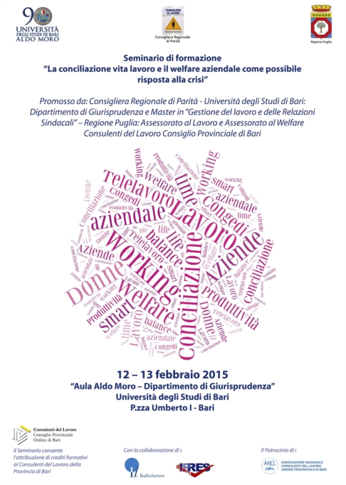 Il 12 e 13 febbraio si terrà a Bari, Università degli Studi Aula Aldo Moro, Piazza Umberto I, il Seminario formativo "La conciliazione vita lavoro e il welfare aziendale come possibile risposta alla crisi", promosso dall'Ufficio della Consigliera Regionale di Parità, dalla Regione Puglia - Assessorato al Welfare e Assessorato al Lavoro - dal Dipartimento Studi giuridici e Master Gestione del Lavoro e delle Relazioni Sindacali dell’Università degli Studi di Bari, dall'Ordine dei Consulenti del Lavoro, con la collaborazione di Italia Lavoro e IPRES. E’ dal 2012 che Consigliera Regionale di Parità e Regione Puglia sono impegnate a sperimentare strategie alternative o complementari per un nuovo più efficace modello economico sociale in cui sia possibile una forte sinergia tra pubblico e privato, tra mercato e società, provando a delineare il nesso tra welfare, crescita ( in termini di occupazione) e sviluppo.