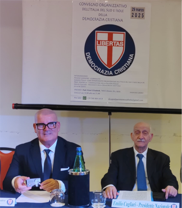 La Democrazia Cristiana, per voce del Presidente nazionale Emilio Cugliari e del Capo Dipartimento per il Sud e per le Isole Ignazio Tullo, intende ribadire con fermezza la legittimità esclusiva del simbolo e del nome storico del partito. «Riaffermiamo con convinzione – dichiara Emilio Cugliari – che l’uso del nostro simbolo e del nostro nome è riservato ai rappresentanti legittimamente riconosciuti, a tutela della storia e dei valori che la Democrazia Cristiana incarna da sempre».