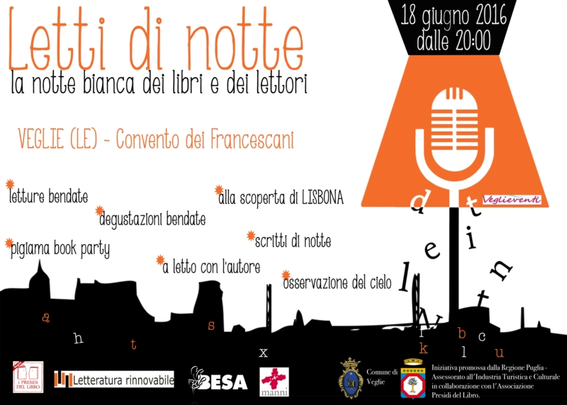 Torna la Notte bianca dei libri e dei lettori a Veglie. Per il secondo anno consecutivo, il Presidio del Libro partecipa al circuito di Letti di Notte, la grande manifestazione organizzata, a partire dal 2012, dall'associazione culturale Letteratura rinnovabile, in collaborazione con numerosi editori e librerie italiani.Questo appuntamento vuole essere l'occasione per promuovere la cultura del libro e della lettura in tutti gli spazi che lo consentono. Quest'anno, il 18 giugno, scrittori, poeti, attori, traduttori, librai, bibliotecari, editori, associazioni culturali saranno promotori e protagonisti di centinaia di eventi, letture, incontri, feste, giochi, concorsi che si svolgeranno in librerie, biblioteche, musei, circoli di lettura di tutta Italia e in alcune città straniere. Una grande festa della lettura a cui partecipa tutto il mondo del libro.