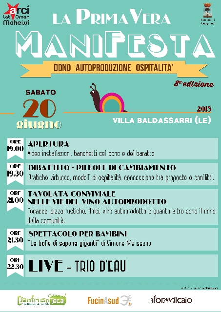 Sabato 20 giugno a Villa Baldassarri nel cuore del borgo ritorna una grande festa di comunità in un piccolo paese del Salento. L’idea alla base dell’iniziativa è provare a sviluppare un percorso di resistenza consapevole per la difesa del saper fare e di tutto quel patrimonio immateriale comunitario costantemente mortificato dal processo di omologazione del pensiero.«Non c’è altro modo di generare cambiamento se non a partire dal basso, dalle comunità e dalla loro consapevolezza». È questo presupposto con cui l’associazione ARCI “lab. Omar Moheissi” organizza per l’ottavo anno consecutivo “La primaVERA maniFESTA: Autoproduzione, dono e ospitalità”.