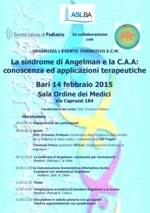 La ASL di Bari in collaborazione con la Società Italiana di Pediatria e con l’OR.S.A. – organizzazione Sindrome di Angelman, organizza, sabato 14 febbraio nella Sala Ordine dei Medici in via Capruzzi, 184, a Bari, l’evento formativo “La sindrome di Angelman e la C.A.A: conoscenza ed applicazioni terapeutiche”.Dopo i saluti del dott. Ermanno Praitano, coordinatore della formazione della ASL Bari per la pediatria di libera scelta e presidente della SIP Puglia e di Tommaso Prisco, presidente di OR.S.A., relazionerà la dott.ssa Lorita La selva sul tema “La sindrome di Angelman: conoscerla per riconoscerla”, seguirà la relazione del dott. Alessandro Chiari sul tema: “La Comunicazione Aumentativa Alternativa rivolta a persone con sindrome di Angelman”.