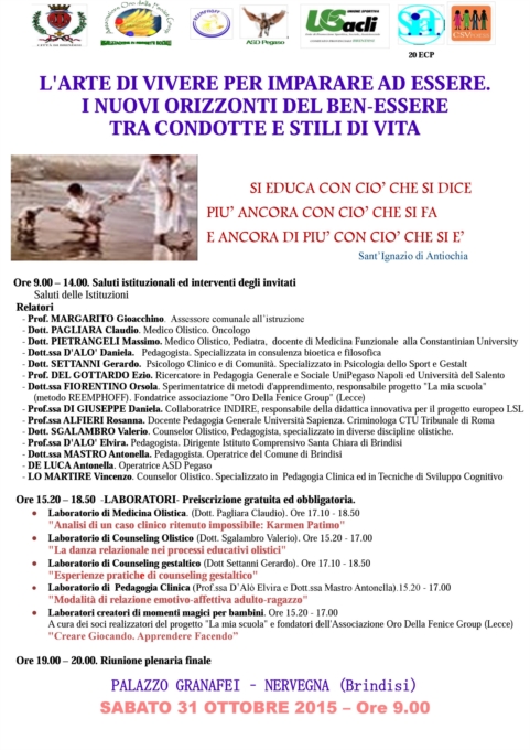Sabato 31 ottobre 2015, alle ore 9.00, presso il Palazzo Granafei-Nervegna di Brindisi, si darà via ad un Convegno di rilevanza Nazionale dal titolo:“L’arte di vivere per imparare ad essere. I nuovi orizzonti del ben-essere tra condotte e stili di vita”.