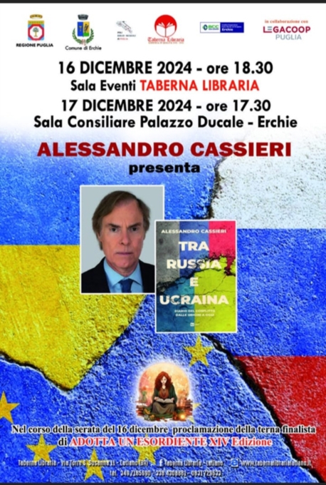 La proclamazione della terna finalista della XIV Edizione del Concorso letterario Adotta un esordiente della Taberna Libraria di Latiano coinciderà, in questo particolare anno scolastico con due appuntamenti di dimensione decisamente mondiale che la libreria di Via Torre Santa Susanna serba in programma nella provincia di Brindisi e che vedranno la presenza del giornalista Rai Alessandro Cassieri, impegnato in un mini-tour di due giorni per la presentazione del suo ultimo libro Rai-Libri dal titolo “Tra Russia e Ucraina – Diario del Conflitto dalle origini ad oggi”. Eventi patrocinati dalla Regione Puglia, dai Poli Biblio Museali di Puglia e da Lega Coop.Una preziosa fonte di informazione che si rivela quanto mai preziosa alla luce degli scenari geopolitici dell'Ucraina, della Siria, del Libano ed Israele che si intrecciano in un filo unico, all'indomani della elezione di Trump. Uno dei più importanti protagonisti del giornalismo italiano arriverà nella Taberna Libraria di Latiano dopo aver raccolto testimonianze, verità, ma soprattutto retroscena dagli scenari bellici e istituzionali in giro per il mondo.