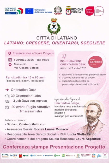 Sarà presentato ufficialmente mercoledì 1 aprile 2026 alle ore 10:30, presso il Municipio, in via Cesare Battisti n. 4, il progetto “Latiano: crescere, orientarsi, scegliere”, presentato dal Comune di Latiano e ammesso a finanziamento dalla Regione Puglia nell’ambito dell’Avviso Pubblico Punti Cardinali FOR work, a valere sul PR Puglia FESR-FSE+ 2021-2027.L’incontro rappresenterà un momento pubblico di avvio di un percorso strutturato e innovativo, finalizzato a rafforzare l’orientamento al lavoro, sostenere l’inclusione sociale e valorizzare le opportunità offerte dal territorio.