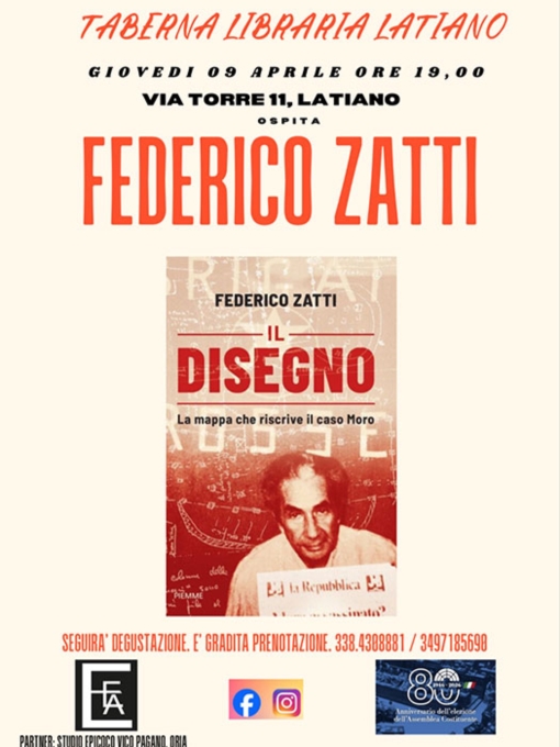 Un nuovo appuntamento della rassegna "Cultura, Spettacolo e..." promossa dalla Taberna Libraria di Latiano, che attraverso una programmazione costante e articolata, continua infatti a proporre occasioni di incontro, confronto e crescita, coinvolgendo autori, lettori e appassionati in un percorso condiviso che valorizza la cultura come strumento di comunità.In questo solco si inserisce il nuovo interessante incontro con l'autore in programma giovedì 9 aprile 2026, alle ore 19, presso la sala eventi della libreria, dove si terrà la presentazione del libro "Il disegno" (Edizioni Piemme) di Federico Zatti.