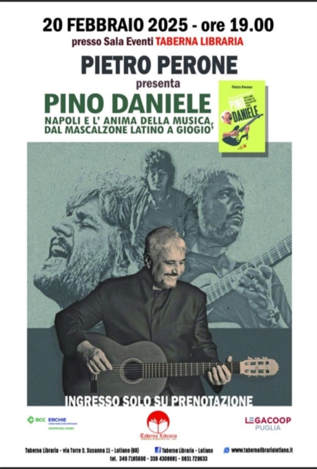A dieci anni dalla scomparsa dell'autore e interprete del capolavoro "Napul'è" la Taberna Libraria di Latiano dedica una serata nella propria sala eventi al grande Pino Daniele, un momento evocativo e solenne rientrante nella rassegna letteraria "Cultura, Spettacolo e..." firmata in collaborazione con BCC di Erchie, SummerTime – Animazione & Spettacolo e Pomarico Serramenti, per ricordare un cantautore che attraverso le note, armonizzate in chiavi musicali e trasformate in capolavori, ha regalato all'umanità e alla sua tormentata Napoli canzoni senza tempo. Ospite della serata, in programma giovedì 20 febbraio a partire dalle ore 19 il giornalista Pietro Perone presenterá il libro dal titolo "Pino Daniele Napoli e l'anima della musica, dal Mascalzone Latino a Giogiò" (Edizioni San Paolo 2024); un modo per apprezzare pienamente, attraverso le parole di chi ha conosciuto Pino Daniele dialoghi, desideri ed emozioni che aspettano solo di essere ascoltati ed apprezzati.