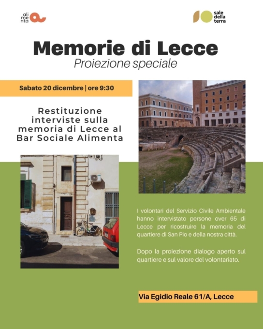Il progetto di Servizio Civile Ambientale "Cammini Generativi" della Rete Sale della Terra propone un ultimo incontro sulle radici e la memoria urbana della città sabato 20 dicembre dalle 9.30 presso il Bar Sociale Alimenta con la proiezione di alcune voci della città e delle loro memorie.